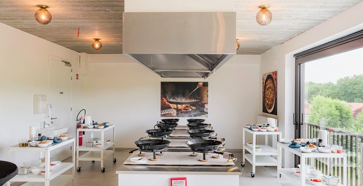 Bij Socarrat staan wij zelf achter de potten voor take away en paellacatering op onze of jouw locatie. En organiseren we unieke paellaworkshops (foto onder). De deelnemers ontdekken de kneepjes van het vak en maken vervolgens zelf een paella klaar aan ons op maat gemaakte kookeiland.