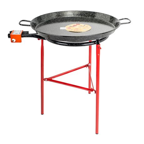 Un ensemble paella se compose de trois éléments de base : une poêle à paella, un brûleur à gaz et un support / trépied, comme le montre l'image.