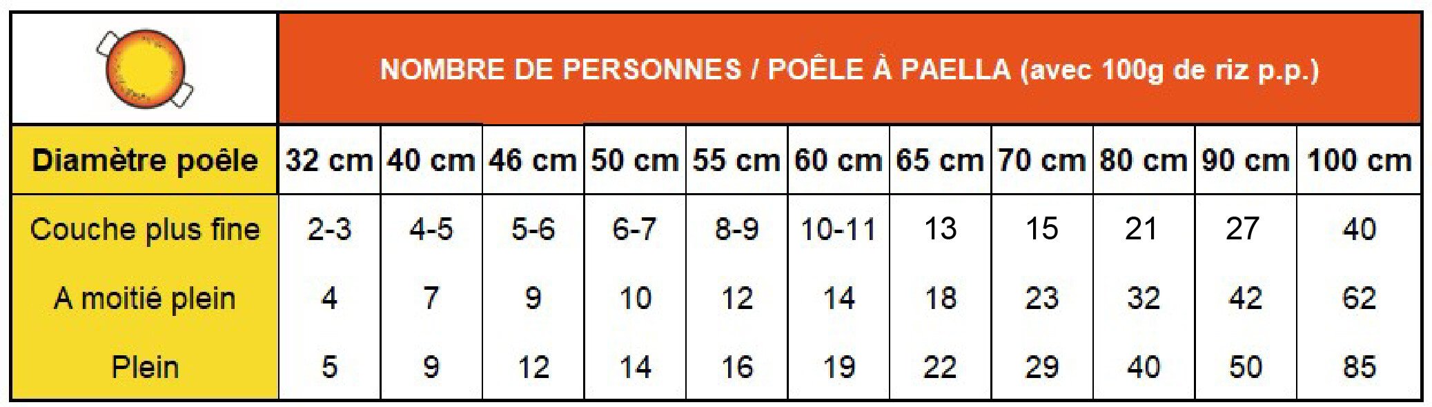 Sous le tableau, vous trouverez notre conseil pratique pour interpréter correctement ces données et pour choisir le diamètre de poêle à paella le plus adapté à votre usage.