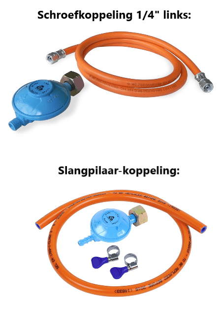 De gasbranders van Paellashop zijn voorzien van een "slangpilaar"-aansluiting, waarbij de gasslang met zowel de gasdrukregelaar als met de gasbrander verbonden wordt door deze over een pilaar/tule te schuiven en vervolgens vast te klemmen met vlindermoeren. Maar er wordt steeds een koppelstukje meegeleverd waardoor onze gasbranders ook voor de "schroefkoppeling (1/4 links)" geschikt zijn. Elke klant kan dus het systeem van haar/zijn voorkeur kiezen.