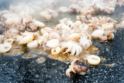 Bij vis wordt best gekozen voor een stevige vis die bij het begin wordt gebakken en dan aan het einde weer toegevoegd. Voor gamba's geldt hetzelfde, bak ze met de schaal en indien mogelijk ook de kop die veel smaak afgeven, en voeg ze aan het einde (al dan niet gepeld) weer toe zodat ze niet uitdrogen. Intktvis wordt heel vaak gebruikt in paella en geeft veel smaak af, net zoals het vocht van mosselen en schelpen. Kreeft of sint-jacobsvruchten zijn feestelijke opties.